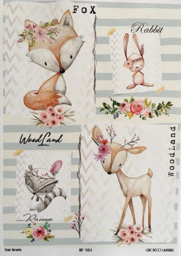 Lámina decoupage tamaño A4 (32x23 cm) diseño animalitos nordicos, codigo INF-101